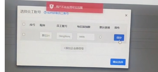 1. 产生原因:在做企微授权时,没有把该员工选择到应用可见范围内,导致应用没有权限贴加该员工。