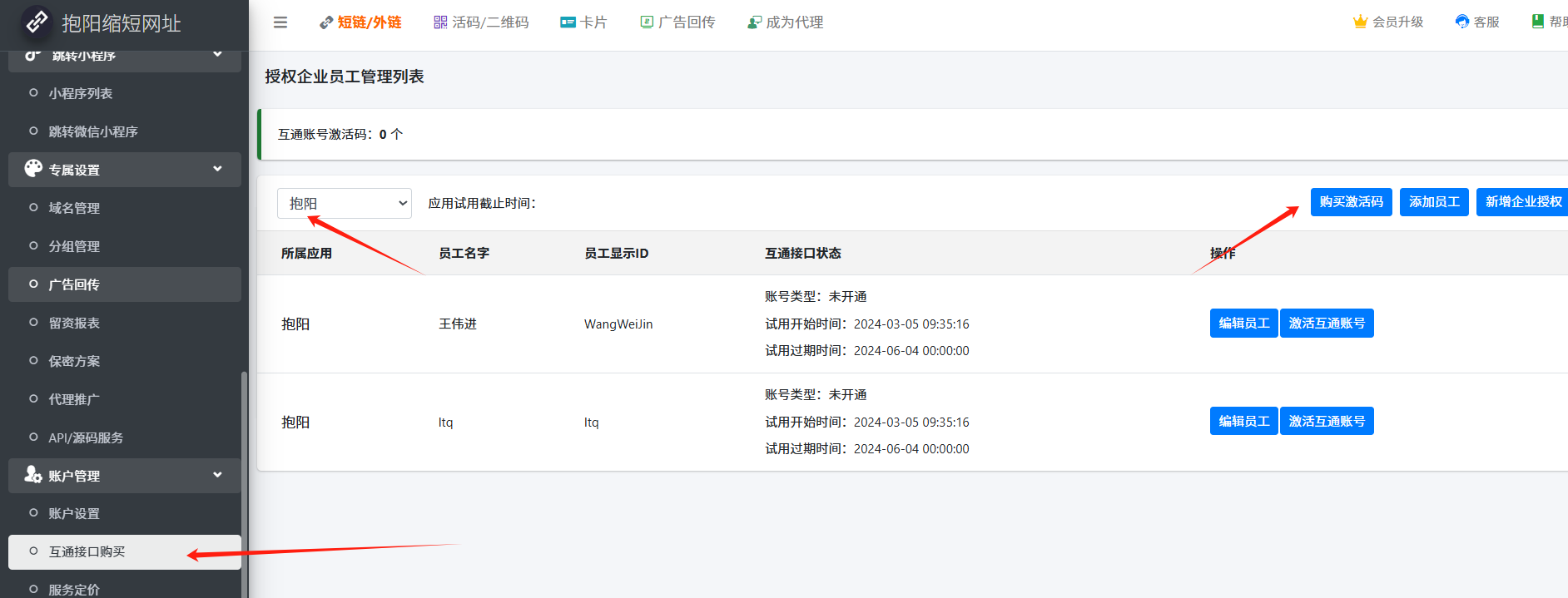 2. 解决办法:【账号设置】-【互通接口购买】,根据自己需要购买企微的互通接口数量。